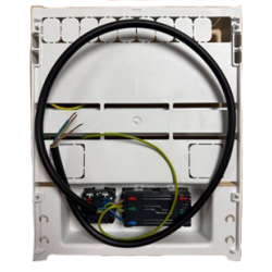 • 1 Fond de coffret avec son rail RJ45 relié au bornier de terre + 1 socle recevant 3 PC 230V 2P+T